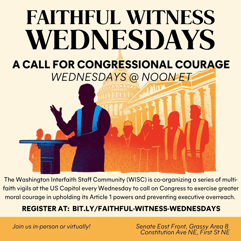United Women in Faith joins Sojourners and other faith-based organizations of the Washington D.C. Interfaith Staff Community to support faithful witness events on the Capitol Hill grounds that call on Congress to exercise greater moral courage in upholding their Article 1 powers and prevent executive overreach.