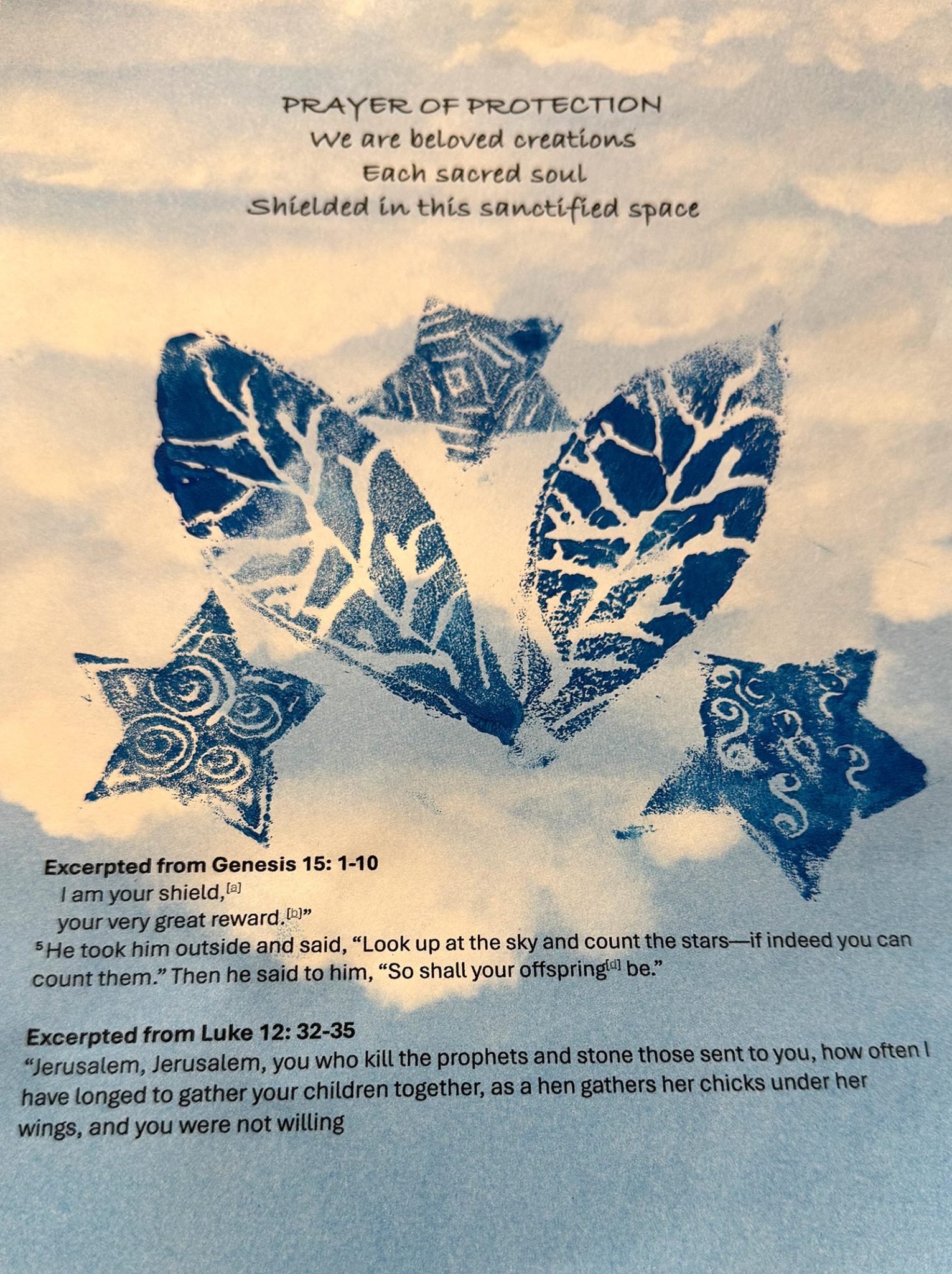 We plan to produce bookmarks and make a banner displaying these prints and the poem. The purpose of the banner (to be displayed in the church entrance) and the bookmarks, is to send a message to those in need that our church is a “safe space.” We also hope to create signs that forbid intrusive agents from doing harm.
