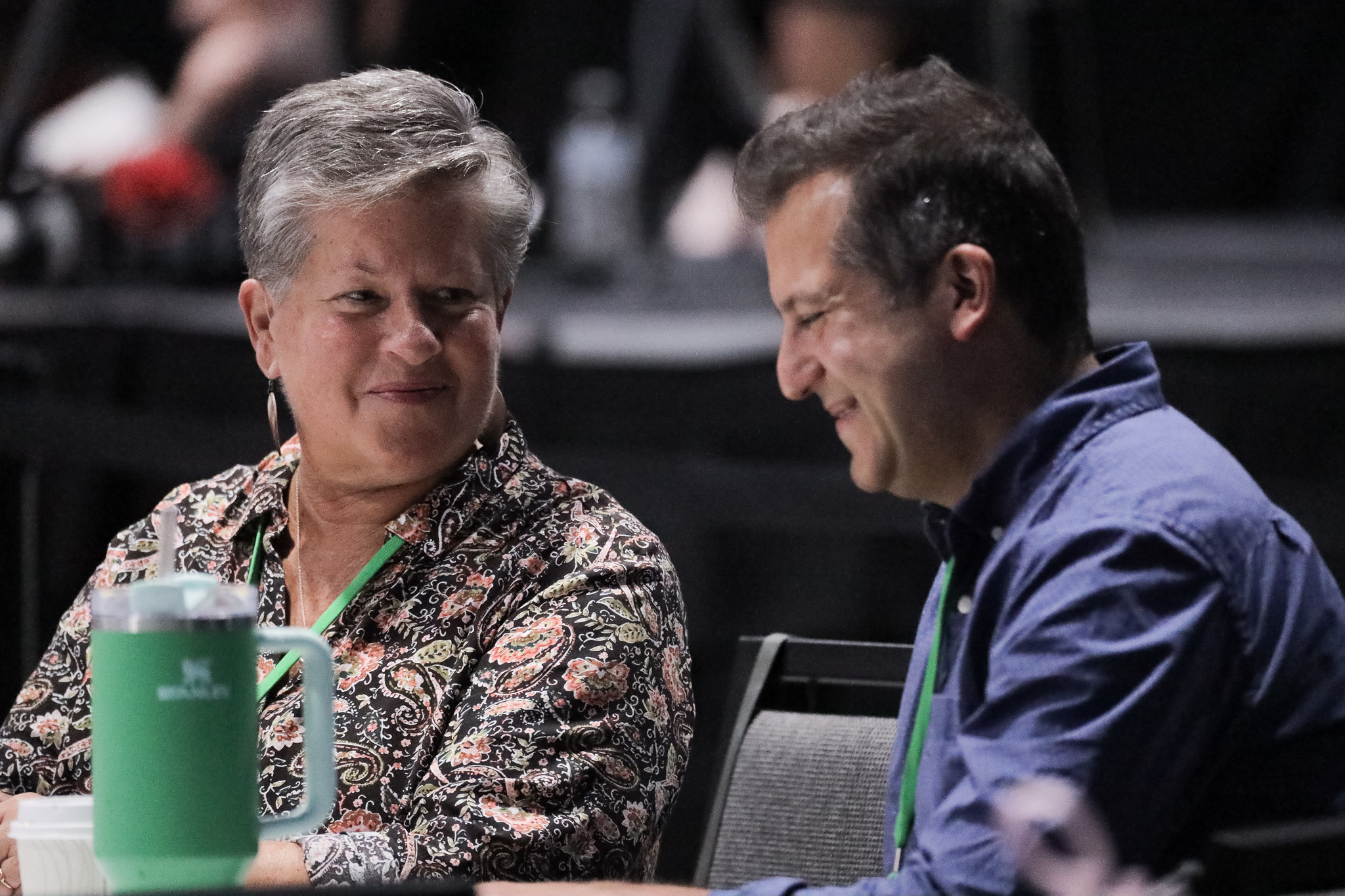 United Women in Faith member Nichea Ver Veer Guy chats with a fellow delegate during the 2024 North Central Jurisdictional Conference. The gathering took place July 10-13 in Sioux Falls, South Dakota. Guy was also elected to the board of directors for the United Methodist General Board of Global Ministries. Photo by North Central Jurisdiction.
