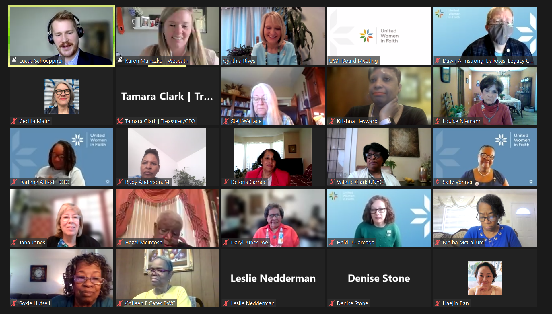 The United Women in Faith Board meeting met for their semi-annual meeting on April 6, 2024. National vice-president Cynthia Rives chaired the meeting in place of National President ‘Ainise ‘Isama’u. Rives opened singing “this is the day the Lord has made” and lifted up prayers for director and staff. The meeting additionally opened with participants naming and acknowledging the Indigenous lands from their location.