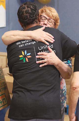 United Women in Faith member pause for a hug as they fill food boxes at the Dallas