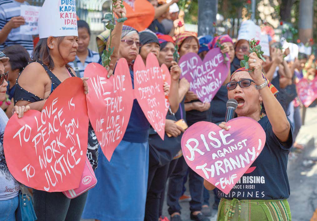 While leading street demonstrations and testifying at legislative hearings is part of Dollaga’s public persona, her witness is deep and comprehensive. Just as her work with Rise Up combined public protagonism with behind- the-scenes pastoral support for the victims of violence, so her work in the campaign to save Mary Jane Velasco—a Filipina migrant worker imprisoned in Indonesia—and her work demanding justice after the 2014 murder of Jennifer Laude—a trans woman—was accompanied by pastoral and other support for the women’s families.
